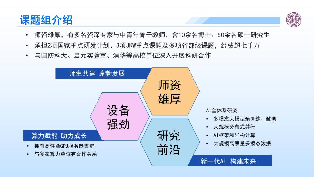 ,协同“先进计算与关键软件(信创)海河实验室”、天津市操作系统重点实验室、天津市软件体验与人机交互重点实验室、国家超级计算天津中心等资源,提供“数据-算法-算力”三维科研支撑。拥有自主构建的TB级高质量多模态数据,为大模型等相关技术研发与生态落地提供全链条支撑。