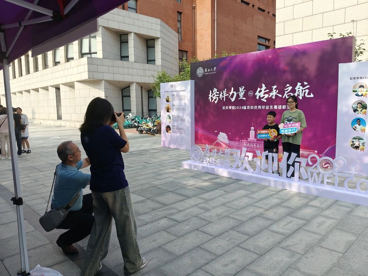 “选一句你喜爱的迎新标语,和它一起留下你在南开的入学剪影吧。”新生在完成入学报到之后都会收到这样的拍照邀请。有趣的形式,新颖的内容使得前来迎新报到的学生和家长踊跃参与。