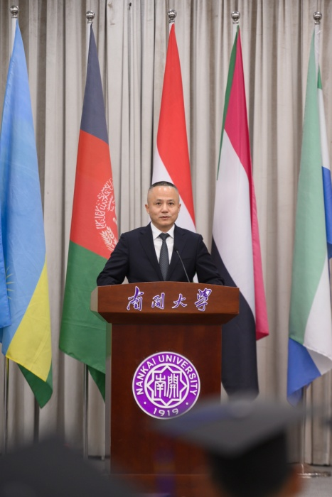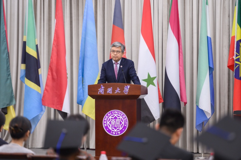 龚克对留学生们圆满完成学业表示衷心祝贺,他用“BEGINNING,ENGINEERING,GREENING,INTELLIGENCE,NANKAI”五个关键词,鼓励诸位留学生秉承南开精神,勇担使命,为创造更美好的世界、促进人类可持续发展贡献力量!