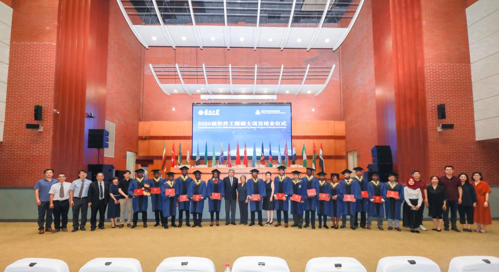2020级援外学历学位教育(软件工程硕士)项目结业仪式在泰达校区杏坛报告厅举行。世界工程组织联合会前任主席、信创海河实验室主任龚克,天津市商务局外经处副处长李丽萍,天津市经开区人社局副局长王平凡出席仪式。