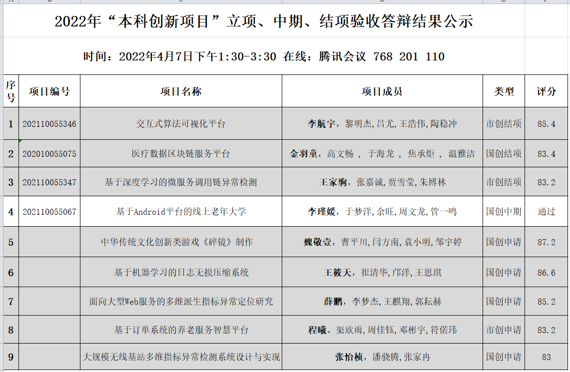 【创新答辩】2022年“本科创新项目”立项、中期、结项验收答辩结果公示