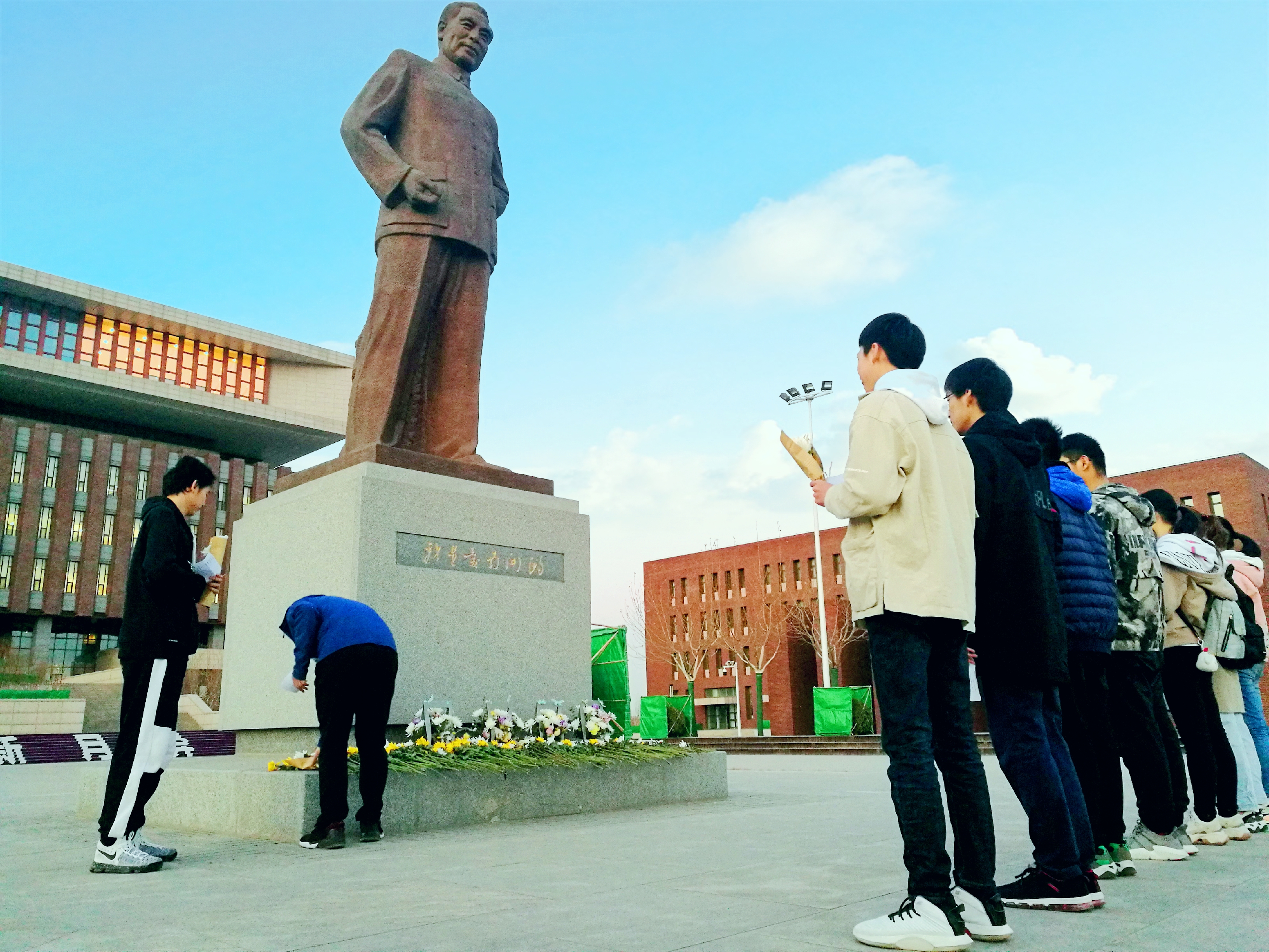 师生手持鲜花来到了总理像前,开展了纪念周恩来总理诞辰121周年——献花缅怀活动。津南校区总理像前,2018级学生代表李柏锋带领同学们声情并茂地朗诵纪念诗歌 ——“天地中华一英才,抚今追昔有恩来。俯首甘为孺子牛,仰止高山最气派”并回顾了总理的生平,表达了对周恩来总理真切热烈的钦佩。活动后,师生代表同向周恩来总理雕像献花默哀。